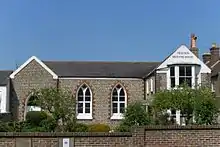 The former school is L-shaped, with a long south wing and a projecting east wing. The façade has flint cobbles with red-brick dressings and grey-brick quoins.[3][4][7] The main wing, of three bays, has two pointed-arched windows with inset pairs of lancet and a similar arched entrance on the left side in a projecting bay.[4][7] The east wing has a full-height canted bay window facing south, set below a stuccoed gable with the painted legend friends' meeting house.[7] This two-storey section was originally the schoolmaster's accommodation.[3]