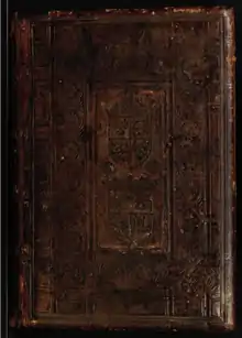 The early sixteenth century gold-tooled calf covers of the Llanbeblig Hours, which both bear the arms of King Henry VIII and Katherine of Aragon in shields separated by two roses, are inlaid in the nineteenth century binding. The binding was thus executed before the 1532 annulment of King Henry's marriage to Katherine of Aragon.[3]