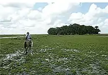 Differing definitions of the area comprising the Llanos de Moxos in northern Bolivia result in estimates of their size ranging from 110,000 square kilometres (42,000 sq mi) to 200,000 square kilometres (77,000 sq mi).[2] This area is characterized by flat terrain, many rivers and shallow lakes, and a tropical climate with pronounced wet and dry seasons. Fifty to sixty percent of the land is flooded from four to ten months per year.[3] The Llanos are located mostly in the drainage basin of the Mamoré River.