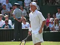 2003 was a relatively disappointing season for Hewitt as he lost the World No. 1 ranking after spending seventy-five consecutive weeks at the top spot and ended his Wimbledon title defence with a first round loss to Ivo Karlović, thus becoming the first player since Manuel Santana in 1967 to fail to defend their title by losing in the first round of the event.[1] However, he successfully defended his title at the Pacific Life Open (becoming the first player to do so since Michael Chang from 1997–1998),[15] reached his fourth consecutive quarterfinal at the US Open (losing to eventual runner-up, Juan Carlos Ferrero in four sets)[16] and led Australia to victory in the Davis Cup[17] (defeating Roger Federer in a memorable five set match en route).[18]