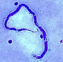 | Loa loa microfilaria found in blood film. (Giemsa stain) | |