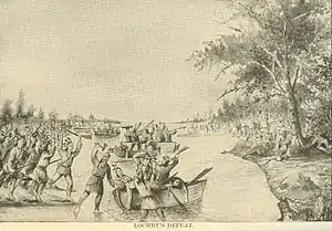 At about 8:00 a.m. on August 24, the day of the battle, Lochry's party landed on the northern bank of the Ohio River, near the mouth of a creek about 11 miles (18 km) below the mouth of the Great Miami.[51] According to some brief accounts, Lochry was lured ashore in a ruse by Brant, who left captured Americans in sight and attacked after Lochry landed.[52] According to more detailed accounts, Brant had planned this deception, but the Pennsylvanians happened to land a short distance upriver without having seen the captives.[53] Nevertheless, Lochry's men came ashore close enough that Brant, who had not yet been reinforced by McKee, was still able to make his attack.