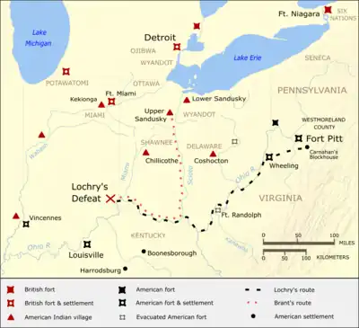 In April, with the New York frontier in ruins, the British transferred Brant to Detroit. The official reason for the move was that Brant was needed to help rally Indian support to counter Clark's anticipated campaign.[34] An apparent unofficial cause was that Brant, who was usually a moderate drinker, had been transferred after getting into a drunken fistfight with an Indian Department officer at Fort Niagara.[35] Although the "Western Indians" of the Ohio Country and Detroit region had strained relations with the Iroquois, they cautiously welcomed Brant's help.[36]