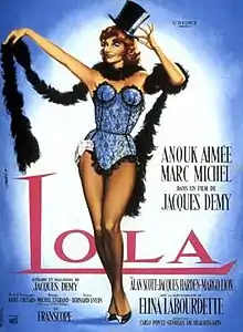 Lola is a 1961 romantic drama film written and directed by Jacques Demy (in his feature directorial debut) as a tribute to director Max Ophüls, described by Demy as a "musical without music".[2][3] Anouk Aimée stars in the title role. The film was restored and re-released by Demy's widow, French filmmaker Agnès Varda.