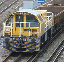 In connection with the construction of the Jubilee Line Extension project, fourteen diesel-hydraulic locomotives were purchased from Schöma of Germany to assist in equipping the tunnels prior to electrification. Weighing 33.88 tonnes each, they are 28 feet (8.5 m) long, and are powered by 500-horsepower (370 kW) six-cylinder inline diesel engines, which give them a maximum speed of 31 mph (50 km/h). They entered service from February 1996,[5] are built to tube tunnel loading gauge, and were fitted with buckeye couplers when built.[6] They are equipped with exhaust scrubbers to prevent soot and other particles from being expelled into the tunnels. The locomotives have since been used on other engineering projects. When not in use they can be found at Lillie Bridge Depot or Ruislip depot.