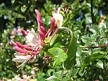 Lonicera caprifolium, the Italian woodbine,[2] perfoliate honeysuckle,[3] goat-leaf honeysuckle, Italian honeysuckle, or perfoliate woodbine, is a species of perennial flowering plants in the genus Lonicera of the family Caprifoliaceae. It is native to parts of Europe, and naturalised in South East Britain and northeastern North America.[2][4] It can readily be distinguished from Europe's most common species, Lonicera periclymenum, by its topmost leaves, which are perfoliate as the Latin name suggests (that is, the stem appears to grow through the centre of the leaf). It is a vigorous, deciduous climber growing up to 8 metres. It bears masses of very fragrant, cream-coloured flowers, tinged with pink, appearing in midsummer.[5][6]