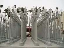 Surrounding the BCAM building and LACMA's courtyard is a 100 palm tree garden, designed by artist Robert Irwin and landscape architect Paul Comstock. Some of the 30 varieties of palms are in the ground, but most are in large wooden boxes above ground.[72][73] Directly in front of the new entrance to LACMA on Wilshire Boulevard, where Ogden Drive once bisected the 20-acre campus between Wilshire Boulevard and 6th Street, is Chris Burden's Urban Light (2008), an orderly, multi-tiered installation of 202 antique cast-iron street lights from various cities in and around the Los Angeles area. The street lights are functional, turn on in the evening, and are powered by solar panels on the roof of the BP Grand Entrance.