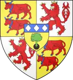 Quarterly: 1st and 4th Or, 2 cows Gules; 2nd and 3rd Argent, to the lion crowned Gules, the forked tail, tied and passed in saltire; overall, gold to. The tree vert, placed on a cake of sand; a chief azure, charged with three lozenges Argent. |