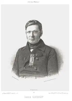 During the July Monarchy Lebeuf was a member of the General Council of Seine-et-Marne. He was made an Officer of the Legion of Honour.[2] Lebeuf was a member of the chamber of deputies from 4 November 1837 to 2 February 1839, representing the Seine-et-Marne department for the government majority. He was reelected for the same seat on the same platform from 2 March 1839 to 12 June 1842.[5] He failed to be reelected on 9 July 1842, and failed again on 1 August 1846.[2]