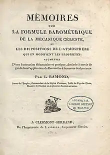- Mémoires sur la formule barometrique de la mecanique celeste, et les dispositions de l'atmosphere qui en modifient les proprietes (in French). Clermont-Ferrand: Pierre Landriot. 1811.