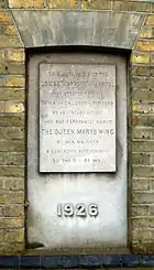 A 1926 extension with rooms for officers' wives and children was intended to offer medical facilities at "moderate charges" to women of the officer class, matching what was available to their menfolk.[8] Queen Mary was said to be interested in this new policy of the military authorities and granted permission for a new extension to be called the Queen Mary Wing. This wing was in fact two separate "unpretentious" extensions to east and west which blended in with the original building and provided accommodation for up to six women and eight children.[9] The Queen made donations towards it: a cheque, linen and silver plate with her crest on.[10] She also presented the hospital with a rocking horse and brass cot once used by Edward VIII.[10] After unveiling a stone tablet in the wall and naming the new wing,[9] she continued to visit the hospital regularly, as she had already been doing for several years.[10] Her visits to the hospital and to a nearby children's home named after her could be combined with frequent royal visits to inspect military activities like cavalry training.[11]
