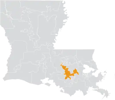 District 2 stretches across a majority-Black swath of Acadiana between New Orleans and Baton Rouge, including parts of Ascension, Assumption, Iberville, Lafourche, St. Charles, St. James, St. John the Baptist, and West Baton Rouge Parishes. LaPlace, Thibodaux, Donaldsonville, and Gonzales are entirely or partially located within the district.[2]