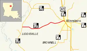 Its route has remained the same to the present day.[3][11] The eastern terminus at LA 15 in Winnsboro was then, as it remains today, also a junction with LA 4 and LA 17.[3][11] US 425 was added to the list in 2005 after its extension from Bastrop southward to Natchez, Mississippi, overlapping LA 15 through Winnsboro.[12]