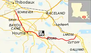The route has two distinct sections, the longer of which travels through Terrebonne Parish on either side of Bayou Terrebonne. It serves as the main highway through the city of Houma, which is also the parish seat. This portion of the highway is bannered east–west, though it runs primarily north–south. Southeast of Houma, LA 24 does assume an east–west trajectory as it turns away from Bayou Terrebonne and proceeds to the Lafourche Parish community of Larose, located at the junction of Bayou Lafourche and the Gulf Intracoastal Waterway.