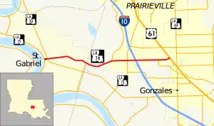 Louisiana Highway 74 (LA 74) is a state highway located in southeastern Louisiana. It runs 10.67 miles (17.17 km) in an east–west direction from LA 75 in St. Gabriel to U.S. Highway 61 (US 61) north of Gonzales.