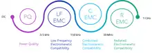 Low-frequency electromagnetic compatibility (LF EMC) is a specific field in the domain of electromagnetic compatibility (EMC) and power quality (PQ), which deals with electromagnetic interference phenomena in the frequency range between 2 kHz and 150 kHz. It is a special frequency range because it does not fit in the PQ problems,[1] with range of up to 2 kHz (3 kHz in 60 Hz mains frequency systems, such as the United States), where relative levels of voltage and current can have massive impact on efficiency and integrity of electric systems, and neither in the conducted EMC range, which starts at 150 kHz and influences mainly informational systems, and already too far from radiated EMC range, which starts at 30 MHz and goes up to 1 GHz.