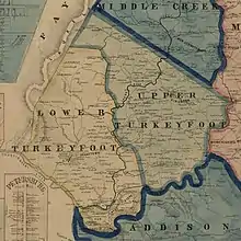 Turkeyfoot Township was formed from part of Brothersvalley Township in 1773, when both were still part of a larger Bedford County; Somerset County was not formed from the western portion of Bedford County until 1795.[3] Just as new counties were split off from earlier counties, new townships were split off from earlier townships, and the townships of Upper Turkeyfoot & Lower Turkeyfoot took their current shapes in 1848.[3] White settlers arrived in the Turkeyfoot area by the late 1760s, and a group of about 15-20 Baptist families came to the area from New Jersey around 1774.[3]