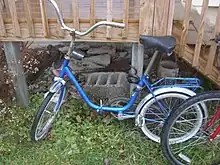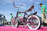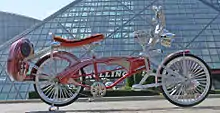 A lowrider bicycle is a highly customized bicycle with styling inspired by lowrider cars.[1] These bikes often feature a long, curved banana seat with a sissy bar and very tall upward-swept ape hanger handlebars. A lot of chrome, velvet, and overspoked wheels are common accessories to these custom bicycles.[1]