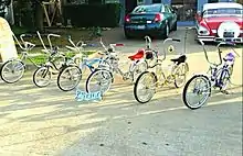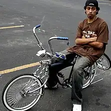 Early modified bikes first appeared in California alongside Lowrider car culture popular in Chicano communities.[5][8] Mexican American youth would emulate the craft of lowrider cars with their bicycles as a canvas for creativity, usually starting with common muscle bikes. This allowed those who were too young to drive a car to have a custom vehicle.[3][9][10][11] Similar to lowrider cars, the bikes were stigmatized as a part of "gang culture" by mainstream America simply because of their origins within the Chicano community.[2][4][11]