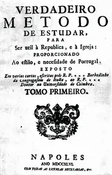 It was around this time that Verney conceived his plan to reform the educational system in Portugal, to bring it closer to the winds of cultural progress that permeated the spirits of progressive Europe. His Verdadeiro Método de Estudar, setting out in summary form his harsh criticism of the existing system and his proposals for changing it, was initially published anonymously in 1746: it soon became the focus of much controversy, which made Verney lose much needed influence at the court of King John V.[3] In Verdadeiro Método de Estudar, Verney argued that grammar should be taught in Portuguese, not Latin, and staunchly defended experimental methods, as opposed to a system of argumentation based on authority, calling into question the influence of the Society of Jesus, who held a near-monopoly of higher education in the country; Verney also approached (without necessarily adopting) some of the principles of the Jansenists and Gallicans in relation to the methods used in theological studies. The book prompted a furious polemic: between its first publication and 1757, over forty books were written in response to Verney's manifesto.[1][2]