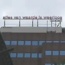 Well known is his line "Alles van waarde is weerloos" from the poem De zeer oude zingt ("The very old one sings"). The adjective "weerloos" means "defenseless", "unable to defend oneself", so the meaning is "All things of value are defenseless". This line was put on top of the office building of an insurance company in Rotterdam (near the Blaak station) in neon letters, including his name, sometime in the 1980s or earlier. It wasn't the first but is certainly the most prominent commercial use of the line; today three more buildings in the area display it on their walls. Similarly, written on the city's central library just across the street is "Heel de wereld is mijn vaderland – Erasmus", "All the world is my fatherland – Erasmus".