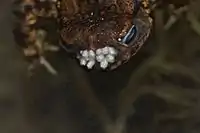 Alternatively, the eggs may be laid in wounds and eat the hosts flesh. When the toad has died and the larvae have totally consumed its tissues and finished their development, they make their way into the soil and pupate. The larvae are sensitive to temperature and only thrive between 14 °C and 29 °C. If they are cooled below this range they will stop feeding and attempt to leave the host and bury themselves shallowly in the soil to hibernate.[2]