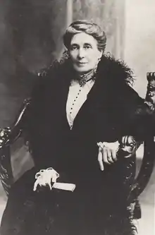 On 24 August 1911, her husband became the first President elect of the Portuguese Republic and, by extension, Lucrécia was made the first First Lady of the country, aged sixty-six. In spite of her pro-monarchy convictions, Lucrécia supported her husband, and moved with the family to Belém Palace, where she was mostly dedicated to the home, per the "female habit" of the time. However, the First Lady avoided public exposure and the commemoration of the second anniversary of the Implantation of the Republic, in 1912, was one of the only occasions she took part in a public event.[1] On 4 October 1913, she presided over an afternoon tea for the children of the National Press employees, having been received as the wife of the Head of State. The following day, on the third anniversary of the instauration of the Republican regime, she attended a play at Teatro Nacional de São Carlos, but was not offered a seat in the presidential tribune.[3] In November of that same year, she attended the "garden party" thrown by Manuel de Arriaga to the Brazilian sailors visiting Lisbon on occasion of the 23rd anniversary of the Brazilian Republic.[3]