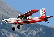 The Lufttransport Staffel 7 drop off parachute reconnaissance units from heights of up to 8000 meters above sea level. It carries out take-offs and landings from makeshift places on the ground for the tactical deployment STOL. In addition, passenger and material transports and connecting flights are carried out for the most varied locations. The service of Lufttransport Staffel 7 is not limited to the repetition course of the Parachute Reconnaissance Company 17. Throughout the whole year, the pilots ensure the service of the parachute reconnaissance school 83 in Locarno with individual service days. Also the creation of aerial photographs (not to be confused with the airphotography for the cartography) belongs in the varied task area. Nowadays the Lufttransport Staffel 7 still has 15 Pilatus PC-6, 14 of them are in olive-green camouflage color. The Pilatus PC-6 with the tailnumber V-622 is decorated in the colors of the Patrouille Suisse and serves as liaison aircraft for the Commander of the Patrouille Suisse.