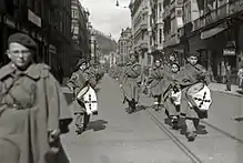In 1939 Larramendi returned to Madrid, still in touch with Don Javier. In 1940 the Alfonsist heir, Don Juan, addressed the regent with a letter, seeking dynastic concord; Larramendi made sure the response was as harsh and uncompromising as possible.[147] He remained a central figure among Madrid Traditionalists[148] and supplied party youth bulletins, issued by semi-clandestine AET, with his articles.[149] Though falling short of openly anti-Francoist language, they constituted a call for loyalty to Carlism, during its history "exonerado, proscrito, confiscado en prisiones, fusilado, asesinado, perseguido, traicionado, calumniado, silenciado, y vendido durante más de un siglo, dado por muerte mil veces", but remaining "tradición inmarcesible de la España eterna".[150] He took part in public Carlist events, tolerated by the regime, e.g. the annual Fiesta de los Mártires de la Tradición[151] or funerals of Carlist leaders.[152]