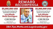 On 30 September 2020, the Drug Enforcement Administration (DEA) published a poster on its Twitter account offering up to US$5 million for information that could lead to the capture of Motta Domínguez.