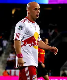 After a lengthy process, Rodgers eventually signed with Major League Soccer club New York Red Bulls in January 2011.[44] He made his MLS debut two months later, in a goalless draw with the Columbus Crew.[45] The following month, Rodgers scored his first two goals and assisted strike-partner Thierry Henry in a 3–0 win over the San Jose Earthquakes.[46][47] For this feat he was named as the MLS 'player of the week'.[48] Rodgers told reporters that "this is the happiest I've been in football."[49] He scored nine goals in 23 league games, as head coach Hans Backe tended to select Rodgers ahead of USA international Juan Agudelo as Henry's strike partner. This was despite Rodgers missing two months of the campaign with plantar fasciitis.[50] His "feisty nature" led him to become a fan's favourite at the Red Bull Arena.[51]