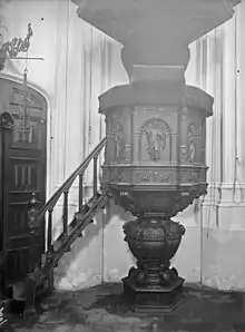 Carved oak banks with wrought iron neo-Gothic decorations, candelabras, and prayer book holders date from the time of construction. The oak pulpit dates from about 1625, and originates from the Old St. Peter church that was demolished in 1645-1646. The copper lectern dates from 1690. The sounding board dates from 1844. The organ from 1780 was probably built by J.S. Strümphler.[4] In 2014 this organ was moved to the Protestant Church of 's-Hertogenbosch.[5]