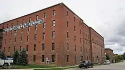 The Lyman Woodard Furniture and Casket Company Building is a large Commercial Italianate brick factory building, containing several connecting production areas, ranging from two to five stories high. The factory has simple four-over-four double hung sash windows in bowed arch openings. The brickwork features brick bandcourses and pilasters, and a trabeated brick corniceline. [2]