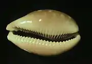 ![]() A shell of Lyncina vitellus, anterior end towards the right |