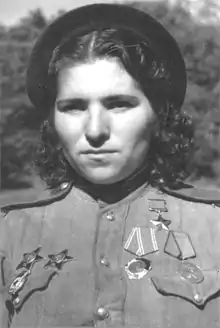 Lyudmila Stepanovna Kravets (Russian: Людмила Степановна Кравец, Ukrainian: Людмила Степанівна Кравець; 7 February 1923 – 23 May 2015) was a medic in the 63rd Guards Rifle Regiment during World War II. For her actions in the war, she was awarded the title Hero of the Soviet Union on 31 May 1945.