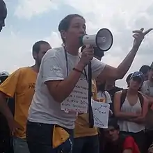 Kräuter giving a lecture about tear gas during a sit in, in Caracas, 2017