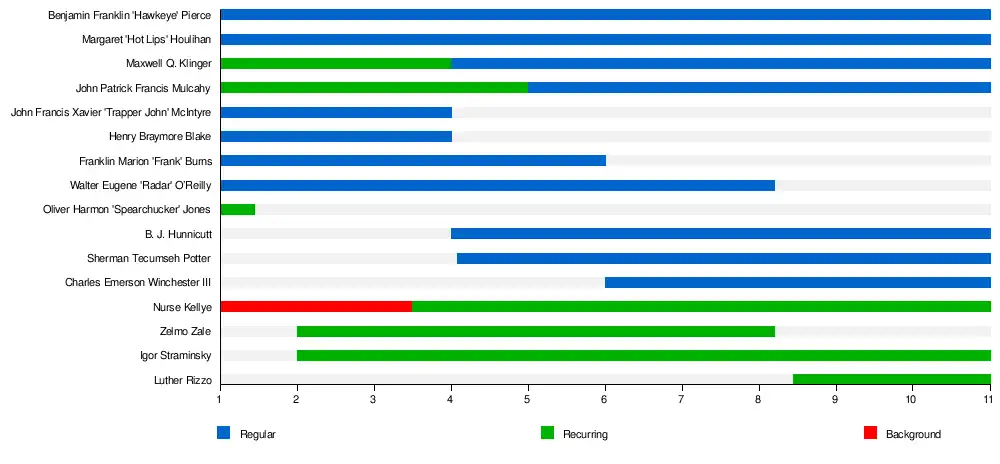For the first three seasons, the show's ensemble cast included Alan Alda as surgeon Captain Benjamin Franklin "Hawkeye" Pierce, Wayne Rogers as surgeon Captain Trapper John McIntyre, McLean Stevenson as company commander Lt. Colonel Henry Blake, Loretta Swit as head nurse Major Margaret "Hot Lips" Houlihan, Larry Linville as surgeon Major Frank Burns, Gary Burghoff as company clerk Corporal Walter Eugene "Radar" O'Reilly, Jamie Farr as combat medic Corporal Maxwell Klinger, and William Christopher as chaplain 1st Lieutenant Father John Patrick Francis Mulcahy. At the end of the third season, Rogers and Stevenson left the show, with their characters written out, and they were replaced by Mike Farrell as surgeon Captain B. J. Hunnicutt and Harry Morgan as surgeon Colonel Sherman T. Potter as the new commanding officer. After season five, Linville left to be replaced by David Ogden Stiers as surgeon Major Charles Emerson Winchester III. Early in season eight, Burghoff left the show; Klinger (Farr) was moved to company clerk to replace Radar, while G. W. Bailey joined the cast to play Staff Sergeant Luther Rizzo, the unit's motor pool sergeant. Other long-serving actors on the show include Kellye Nakahara as Nurse Kellye, Jeff Maxwell as Private Igor Straminsky, Johnny Haymer as Sergeant Zelmo Zale, the supply sergeant, Allan Arbus as psychiatrist Major Sidney Freedman, and Edward Winter as intelligence officer Colonel Sam Flagg.