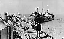 Around 10 January 1941, Esso Hamburg left Cherbourg for the North Atlantic, taking a position south of Cape Farewell in Greenland.[3] Esso Hamburg was part of Operation Berlin, which sailed on 22 January 1941, along with the naval oilers Uckermark and Ermland plus the tankers Schlettstadt, Adria and Friedrich Breme.[4] Esso Hamburg sailed north for approximately four weeks before encountering two cruisers. Following standard procedure, the ship tried to flee before the cruisers overtook Esso Hamburg and identified themselves as the Scharnhorst and Gneisenau.[3] On 14 February 1941, as part of Operation Berlin, Esso Hamburg shipped about 2,582 m3 (568,000 imp gal) of oil to the capital ship Scharnhorst.[3][5] According to later prisoner statements, the ship remained in the area north of the Grand Banks of Newfoundland for over two months, where the cold was considered intense (as the crew lacked warm clothing).[3] These prisoners stated that American patrol vessels capable of 20 knots were sighted and Esso Hamburg was fired on, leading Captain Braunwarth to think his ship was being followed.[3] According to Captain Braunwarth (whose interrogation statements have been proven to be false or unreliable), he decided to return to port in St. Nazaire after the rudder was damaged in a storm.[3] On 12 April, the ship returned to port, completing its first Atlantic voyage.[3]