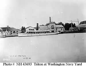 In September, 1889, the Navy reversed its decision, and paid the P. Doherty & Sons Company $30,000 for the acquisition, and re-christened the tug USS Triton and given a numerical number as well (Harbor Tug No. 10). The tug was assigned to the Washington Navy Yard where it spent 41 years working from 1889 to 1930.
