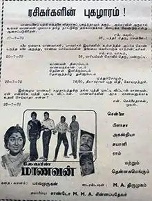 Maanavan (transl. Student) is a 1970 Indian Tamil-language film directed by M. A. Thirumugam and produced by Sandow M. M. A. Chinnappa Thevar under Dhandayudhapani Films. The script were written by Balamurugan. The film starring Jaishankar and Muthuraman with Sowcar Janaki, Lakshmi, Nagesh and Sachu in supporting roles. Kamal Haasan appears only for a dance sequence along with Kutty Padmini. Hassan returns to Cinema as a teen actor after a seven-year hiatus. The film also marks the debut of many character actors and comedians like Pandu, Kathadi Ramamurthy among others.