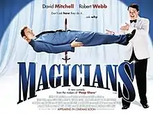 Magicians is a 2007 British comedy film released on 18 May 2007.[1] It stars comic duo Robert Webb and David Mitchell as stage magicians Karl and Harry. The two magicians compete together in a magic competition, despite their personal differences. Parts and ideas of the film have been taken to parody the 2006 film The Prestige by Christopher Nolan, though this had not been released when Magicians was filmed (though the original novel by Christopher Priest had been published in 1995). The film is directed by Andrew O'Connor and written by Jesse Armstrong and Sam Bain, who are also the writers of the Channel 4 sitcom Peep Show, which stars Mitchell and Webb. Other principal cast members include Jessica Hynes, Darren Boyd, Steve Edge, Peter Capaldi,[1] and Andrea Riseborough.[2]