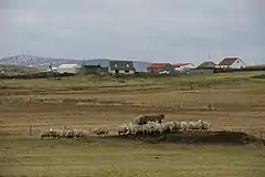 ![]() Sheep and buildings at Mail, looking north, with the Ward of Bressay in the distance | |