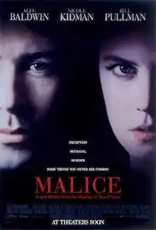 Malice is a 1993 neo-noir[5] thriller film directed by Harold Becker, written by Aaron Sorkin and Scott Frank, and starring Alec Baldwin, Nicole Kidman, Bill Pullman, Anne Bancroft and George C. Scott. Adapted from a story by Jonas McCord, the plot follows Andy and Tracy Safian, a newlywed couple whose lives are upturned after they rent part of their Victorian home to Jed, a cavalier surgeon; things are further complicated when he removes Tracy's ovaries during an emergency surgery to save her life. The film features supporting performances from Bebe Neuwirth, Peter Gallagher, and Tobin Bell, with minor appearances from Gwyneth Paltrow and Brenda Strong.