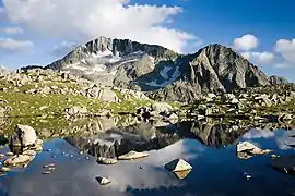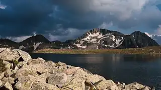 Malokamenishki Lakes are among the largest lake groups in Pirin by number. They are situated at altitudes between 2,537 m and 2,190 m. Two of the lakes have an area of over 10,000 m2, seven between 1,000 and 10,000 m2 and the rest under 1,000 m2. Most of them are swallow and dry out in summer.[3] The highest eleven lakes are scattered in the folds of the Belemeto cirque centered around the eight lake, Tevnoto. Most of them have unreliable water flow and an area under 1,000 m2.