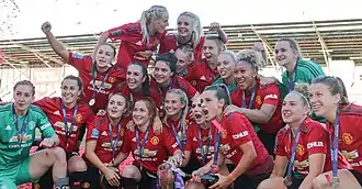 The team's first game back was on 19 August 2018, where they won 1–0 in an away game against Liverpool in the FA Women's League Cup, with Lizzie Arnot scoring their first competitive goal in thirteen years.[13] Three weeks later, their opening Championship encounter ended in a 12–0 victory away to Aston Villa.[14] On 17 April 2019, United secured promotion to the FA Women's Super League following a 5–0 win against the same opposition.[15] They clinched the FA Women's Championship title three days later following a 7–0 win at home to Crystal Palace.[16] In May 2019, Manchester United were named FA Women's Championship Club of the Year at the 2019 FA Women's Football Awards.[17]