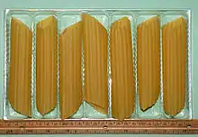 Like the cannelloni of Italian cuisine, manicotti can be extruded in tube form, or rolled from sheets of dough. While manicotti are pointed, cannelloni are smooth with flat ends.
