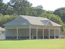 ![]() View of Manners Hill Park showing the pavilion, peppermint trees and a tennis court | |