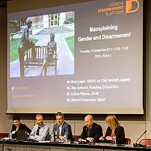 Gender and Disarmament Platform meeting, 14 September 2017. On the slide: a photograph of the sculpture Classmates by Paul Tadlock, which has been called the "mansplaining sculpture"[1] and "Mansplaining The Statue"[2] by people on the internet.