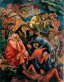 In the early thirties, a virulent campaign was mounted against "Boychukism". This resulted in his dismissal from all his positions and prompted a move to Moscow in 1934. He found a job as a petty bureaucrat, involved with the registration of parades and processions. In 1939, he was able to create some designs for the Moscow State Jewish Theater ("Goset").[1]