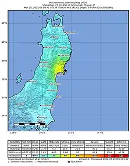 On March 20, 2021 at 18:09 JST (09:09 UTC). The magnitude 6.9 or 7.0 earthquake struck offshore east of Tōhoku, Japan at a depth of 54.0 kilometers (33.6 mi) to 60 kilometers (37 mi).[3][4] It had a maximum JMA intensity of Shindo 5+ while on the Mercalli intensity scale, it earned a rating of VII (Very strong).[5] Power outages and some slight damage in Miyagi was reported.[6]